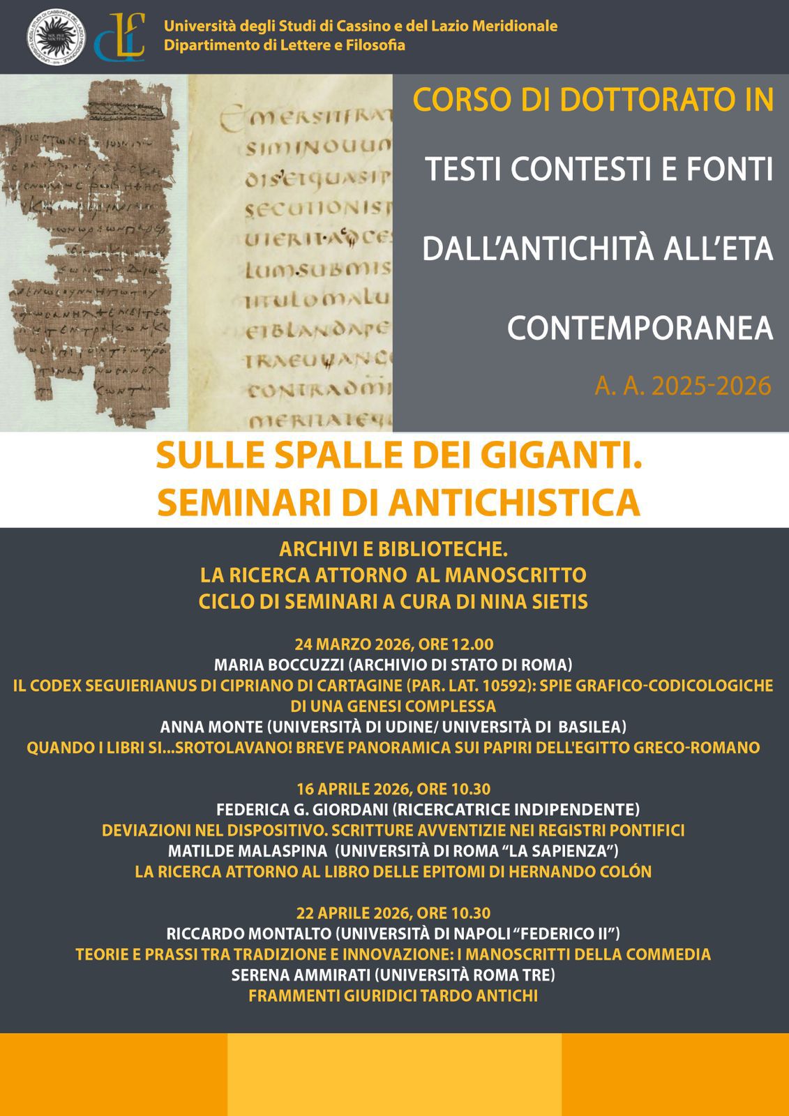Dal 24 marzo al 22 aprile 2026, all'interno dei seminari del Corso di Dottorato in "Testi, contesti e fonti dall'antichità all'età contemporanea", si svolgerà il ciclo dei seminari di antichistica "Sulle spalle dei giganti" dedicato a "Archivi e biblioteche. La ricerca attorno al manoscritto".