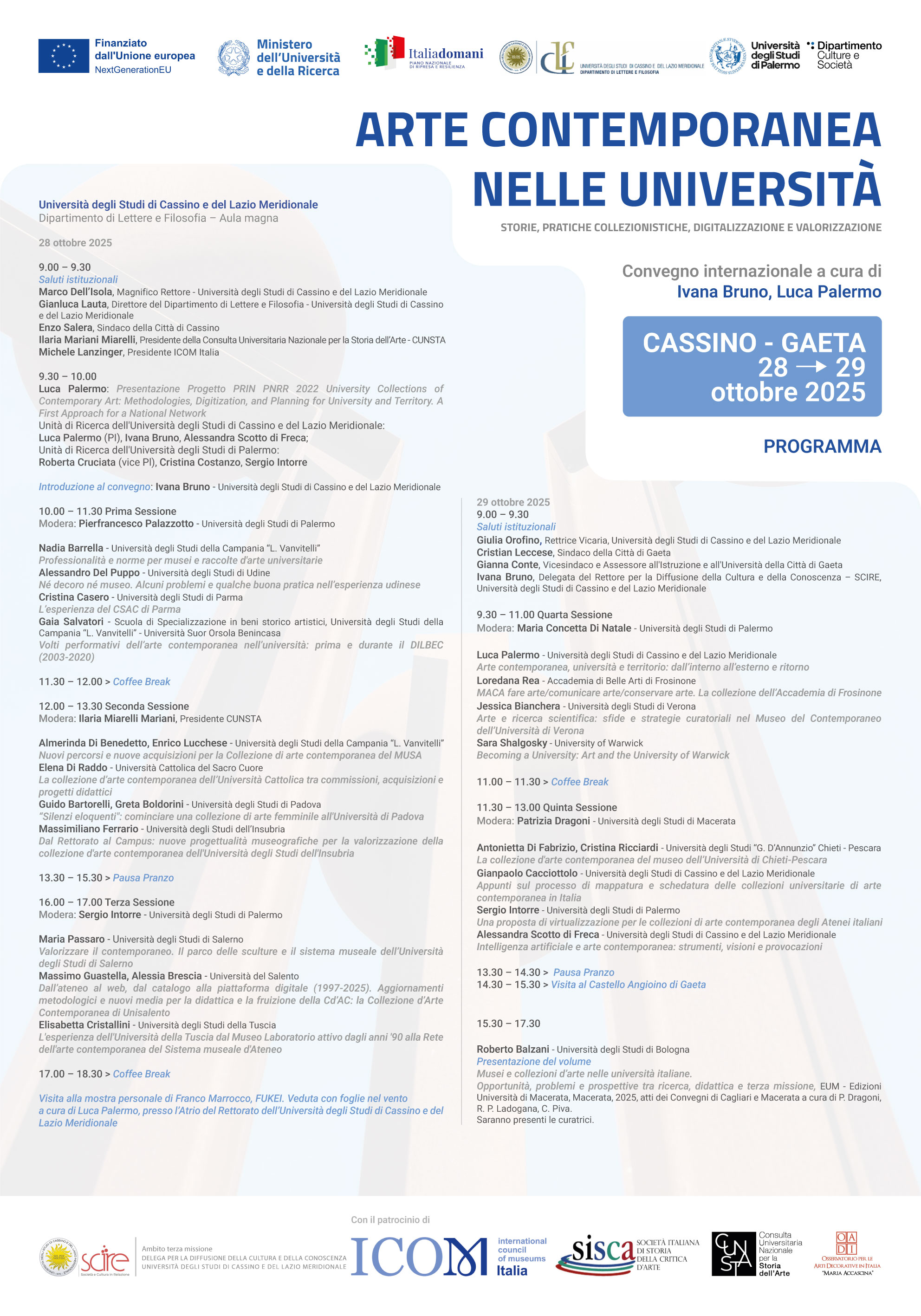 Il Dipartimento di Lettere e Filosofia dell'Università di Cassino e del Lazio Meridionale, in collaborazione con l'Università di Palermo, organizza Arte contemporanea nelle università. Storie, pratiche collezionistiche, digitalizzazione e valorizzazione, che si svolgerà il 28 e il 29 ottobre 2025 tra Cassino e Gaeta, con il patrocinio di ICOM Italia, SISCA - Società Italiana di Storia della Critica d'Arte, CUNSTA - Consulta Universitaria Nazionale per la Storia dell'Arte e OADI - Osservatorio per le Arti Decorative in Italia "Maria Accascina".