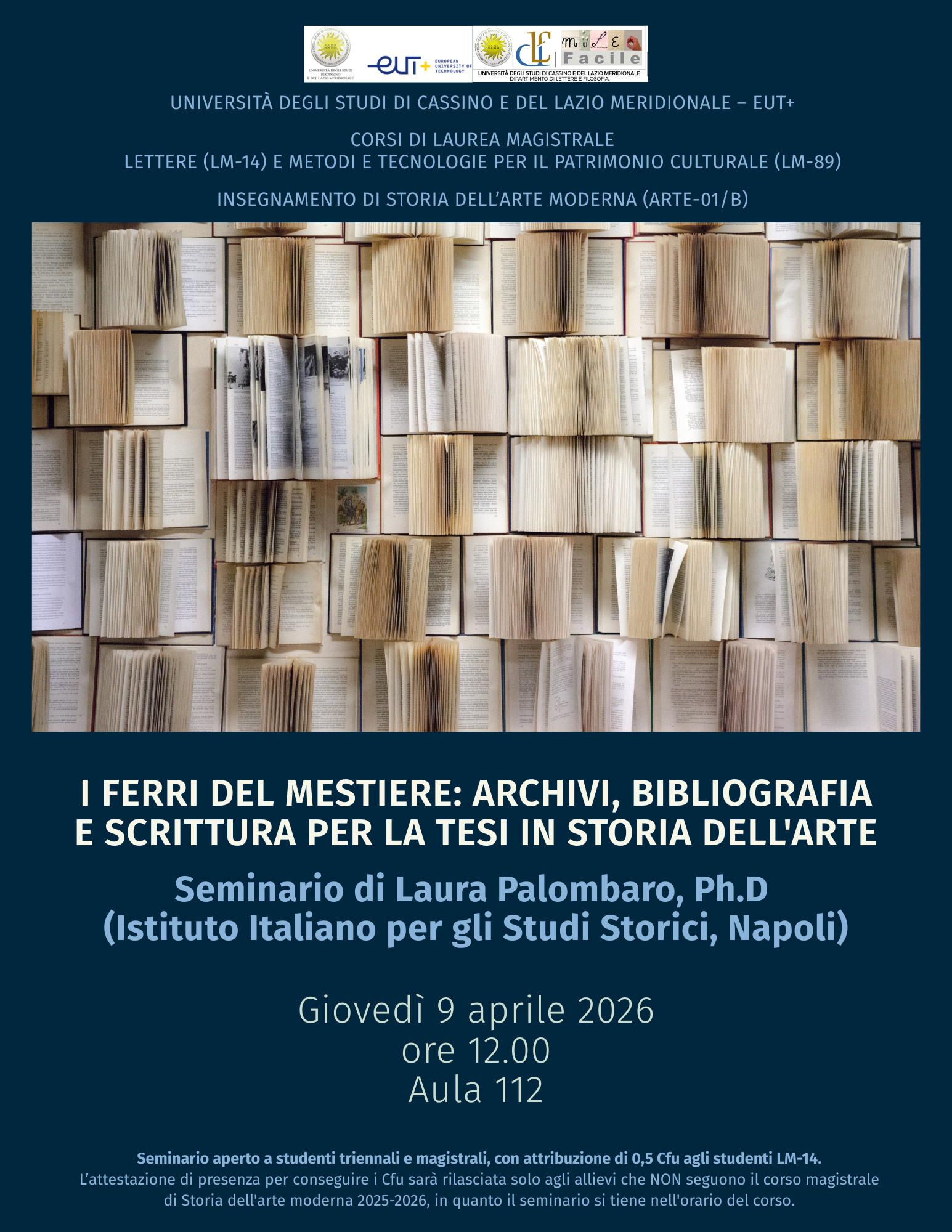 Giovedì 9 aprile, presso l'aula 112 del Dipartimento di Lettere e Filosofia, si terrà il seminario di Laura Palombaro, "I Ferri del mestiere: archivi, bibliografia e scrittura per la tesi in Storia dell'arte".