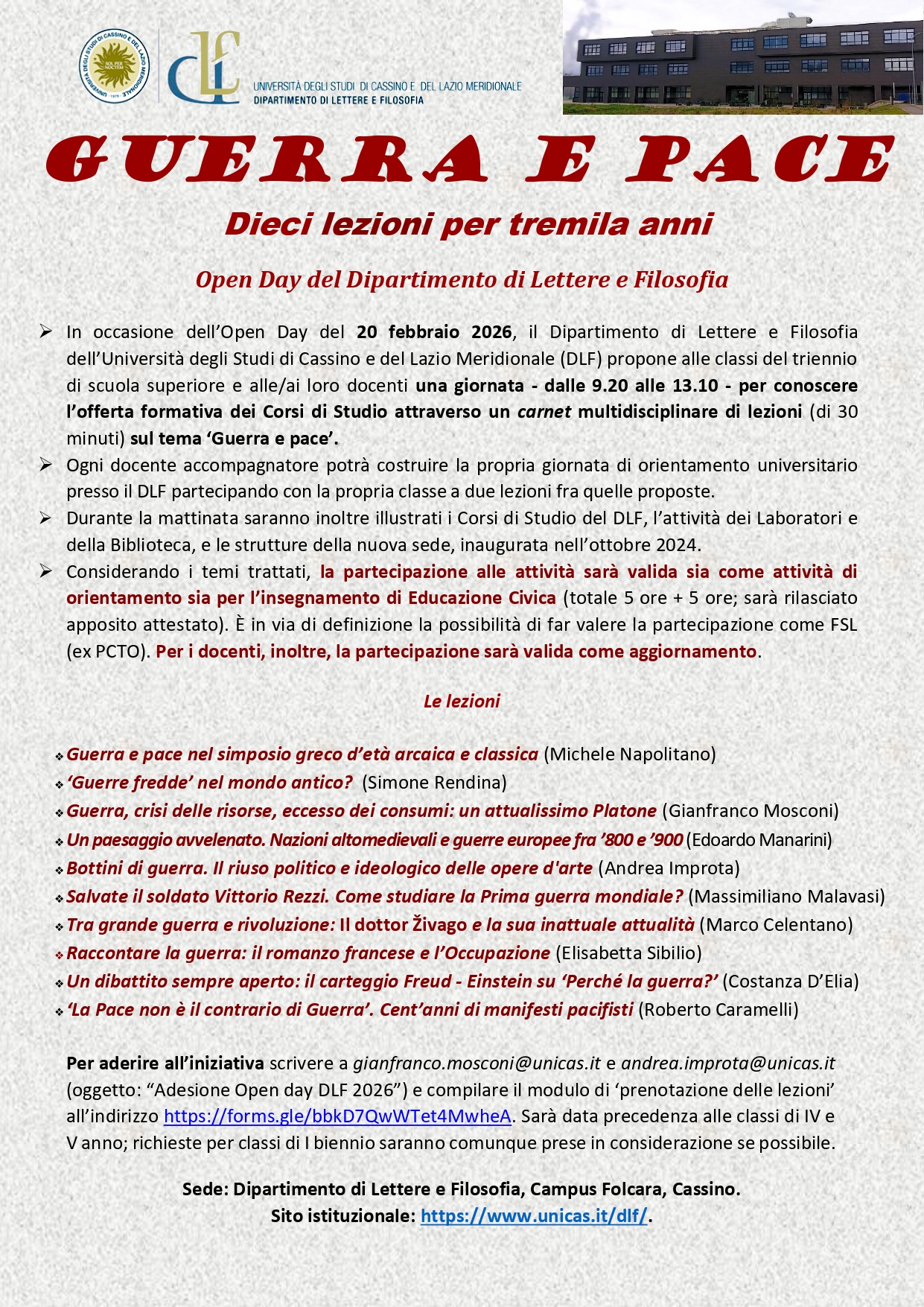 L'Open Day del Dipartimento di Lettere e Filosofia dell’Università degli Studi di Cassino e del Lazio Meridionale (DLF) si terrà il 20 febbraio 2026.
