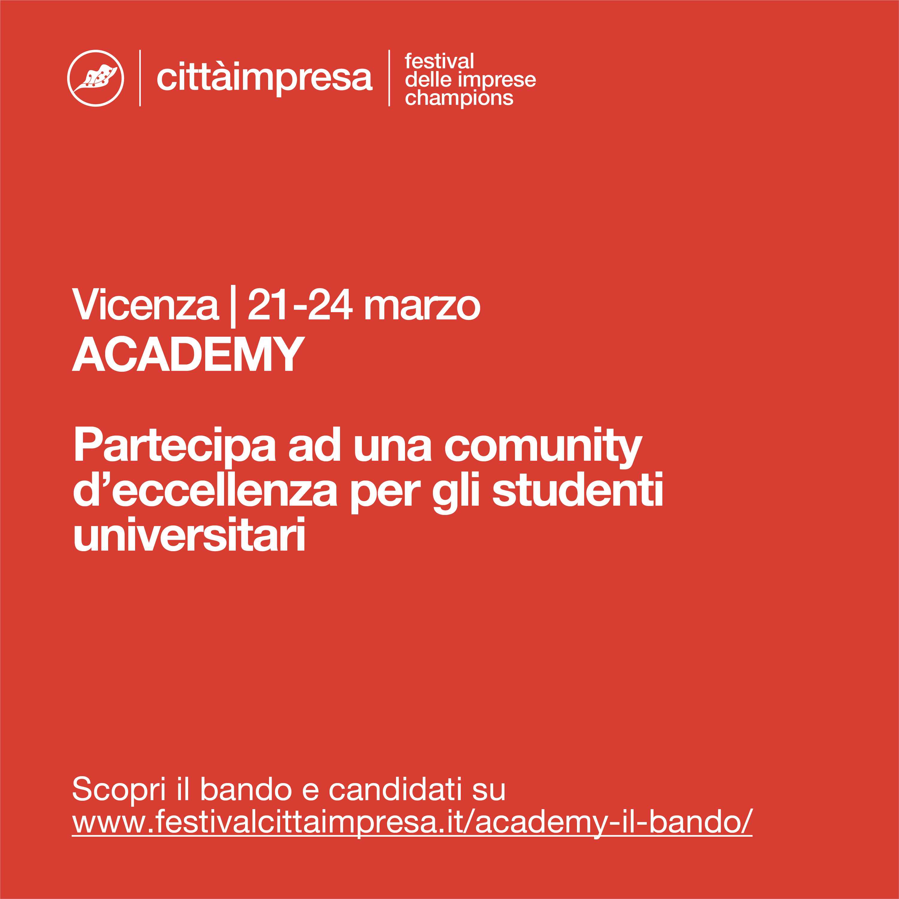 [21/02/2024] Sono aperte da oggi le candidature per partecipare alla Academy del Festival Città Impresa, aperta a studenti universitari, in programma a Vicenza dal 22 al 24 marzo 2024 . Scarica bando, estratto e locandina