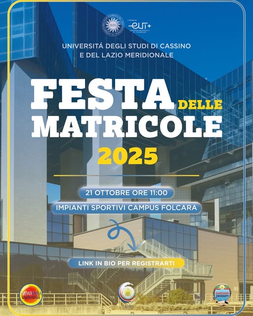 Il Centro Universitario per l'Orientamento dà il benvenuto alle Matricole. Ti aspettiamo martedì 21 ottobre, dalle ore 11, presso il Campus Folcara - campo sportivo del Cus Cassino. Non mancate, sarà una vera e propria festa con musica ed esibizioni sportive e teatrali.