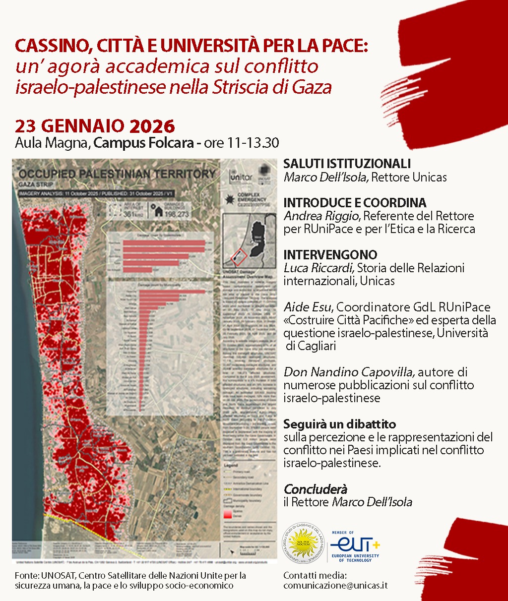 Nell’Aula Magna dell’Università di Cassino, su proposta del Rettore e del Senato Accademico, si terrà un evento pubblico e un dibattito, aperto alla cittadinanza, e a tutte le componenti dell’Università (docenti, studenti e personale tecnico- amministrativo) sull’evoluzione della questione israelo-palestinese nella Striscia di Gaza analizzata a scala internazionale, regionale e locale.