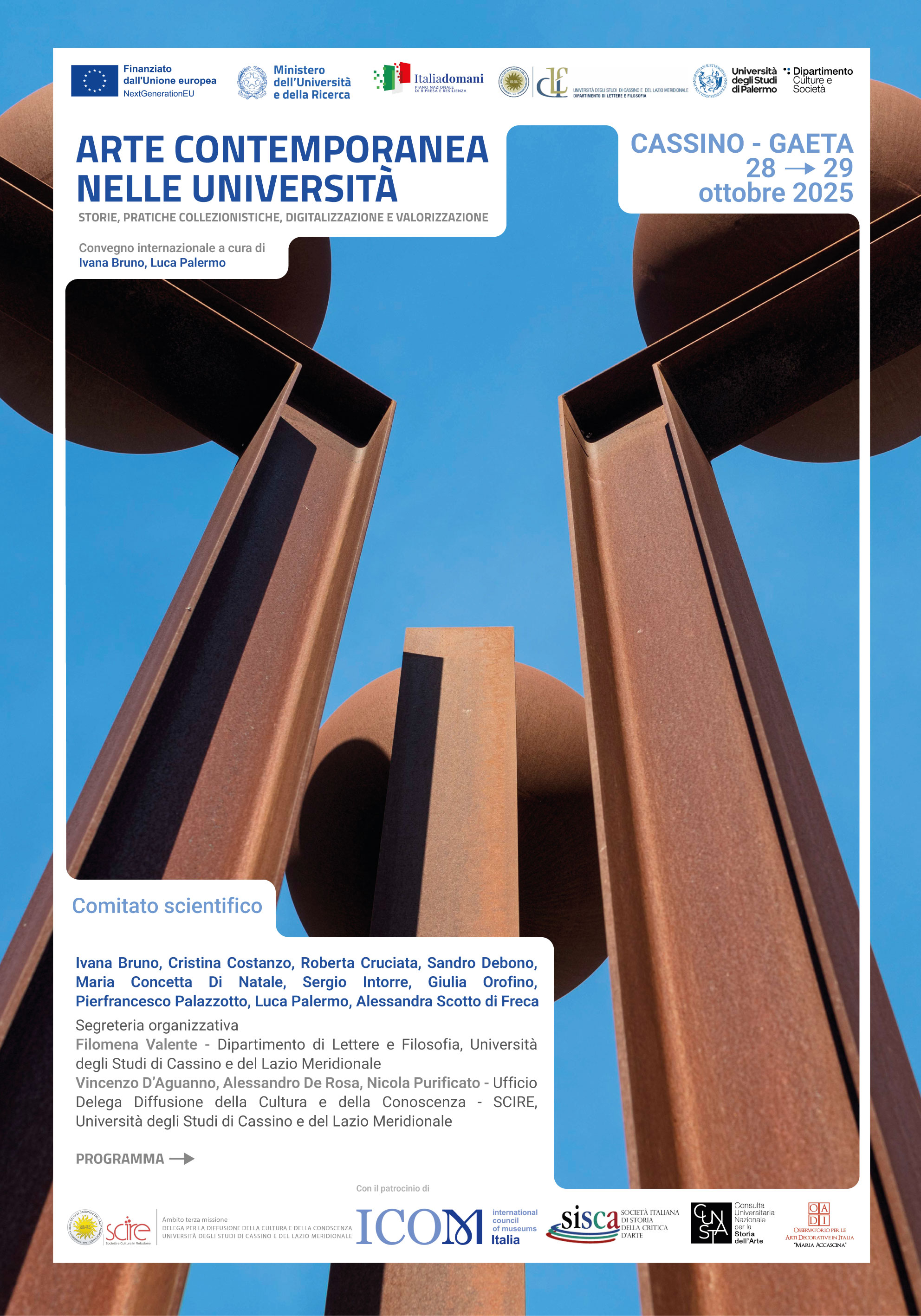 Il Dipartimento di Lettere e Filosofia dell’Università degli Studi di Cassino e del Lazio Meridionale, in collaborazione con l’Università degli Studi di Palermo, organizza il convegno internazionale “Arte contemporanea nelle università. Storie, pratiche collezionistiche, digitalizzazione e valorizzazione”, in programma il 28 e 29 ottobre 2025 tra Cassino e Gaeta, con inizio alle ore 9:00.
