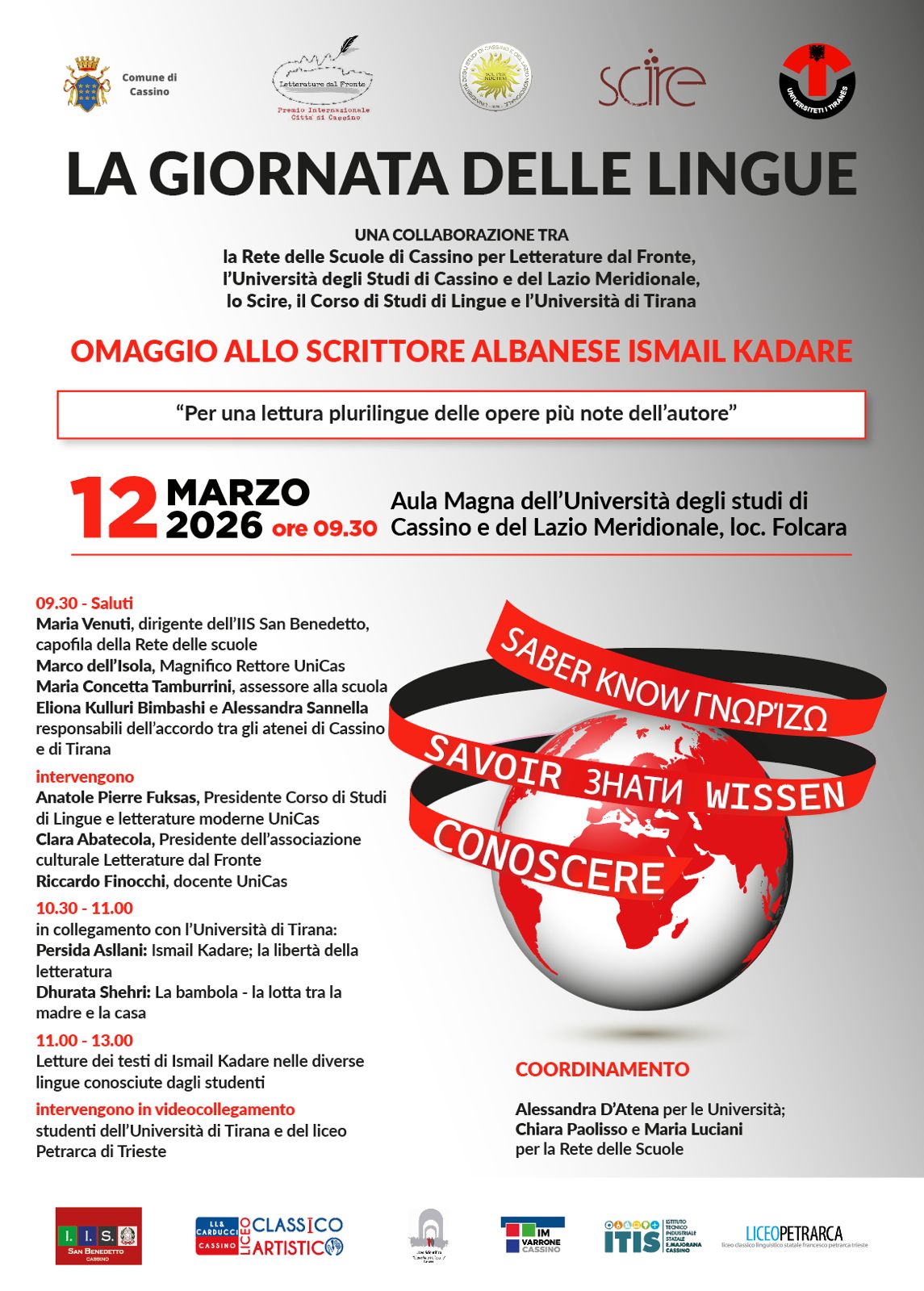 La Giornata delle Lingue 2026 si svolgerà il 12 marzo 2026, dalle ore 9.30, nell’Aula Magna "Federico Rossi", Palazzo degli Studi Unicas, in località Folcara, Cassino (FR)