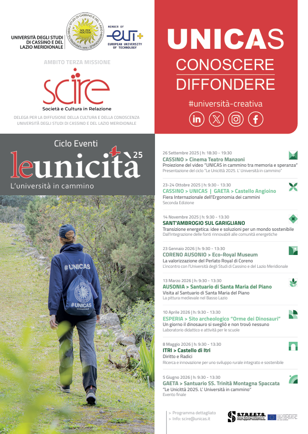 L’incontro, curato dal Dipartimento di Ingegneria Elettrica e dell’Informazione “Maurizio Scarano” – dell'Università degli Studi di Cassino e del Lazio Meridionale – Referente SCIRE Giovanni Mercurio Casolino – è promosso nell’ambito delle attività di Terza Missione, su iniziativa della Delega del Rettore per la Diffusione della Cultura e della Conoscenza, e rientra nel ciclo di eventi culturali “Le Unicittà 2025. L'Università in cammino”.