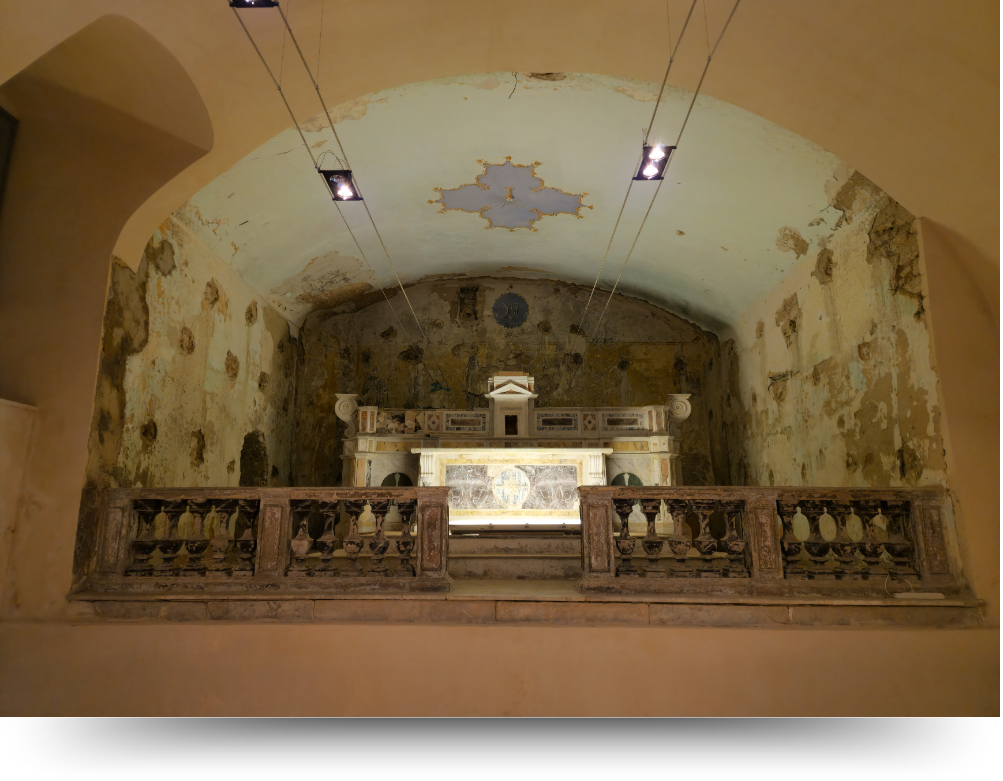 La Cappella è il primo ambiente che si incontra entrando nel Castello. Situata al primo livello dell’edificio, essa si presenta come una grande sala che si sviluppa in lunghezza ed è illuminata da ampie finestre laterali affacciate sul mare. Alla fine della stanza, addossato alla parete frontale, si trova un’abside con un altare di pregio artistico. Questa presenza testimonia l’antica destinazione d’uso dello spazio, che, a partire dal X secolo, fu prima una Chiesa e poi un Monastero intitolato ai Santi Teodoro e Martino. Incorporata nella struttura del Castello nella prima metà del XV secolo, la Cappella subì importanti modifiche alla fine del XIX secolo, assumendo l’aspetto attuale e svolgendo, per gran parte del XX secolo, la funzione di cappella militare. Oggi, l'ambiente ospita gli uffici del personale amministrativo dell'Università degli Studi di Cassino e del Lazio Meridionale (UNICAS), mentre al piano superiore è stata allestita una sala per i convegni.