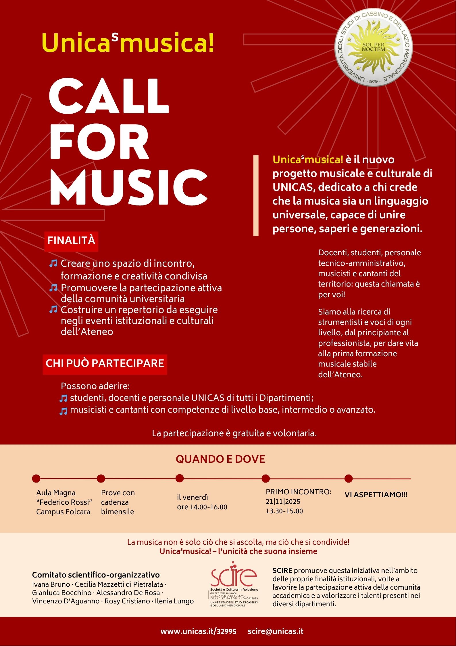 Unicasmusica! è un nuovo progetto musicale e culturale, promosso dalla Delega per la Diffusione della Cultura e della Conoscenza – SCIRE dell’Università degli Studi di Cassino e del Lazio Meridionale, su proposta e con il coordinamento scientifico di Gianluca Bocchino, docente di Storia della musica del Dipartimento di Lettere e Filosofia, volto a valorizzare l’unicità della musica come linguaggio universale e luogo di incontro tra saperi, generazioni e sensibilità.