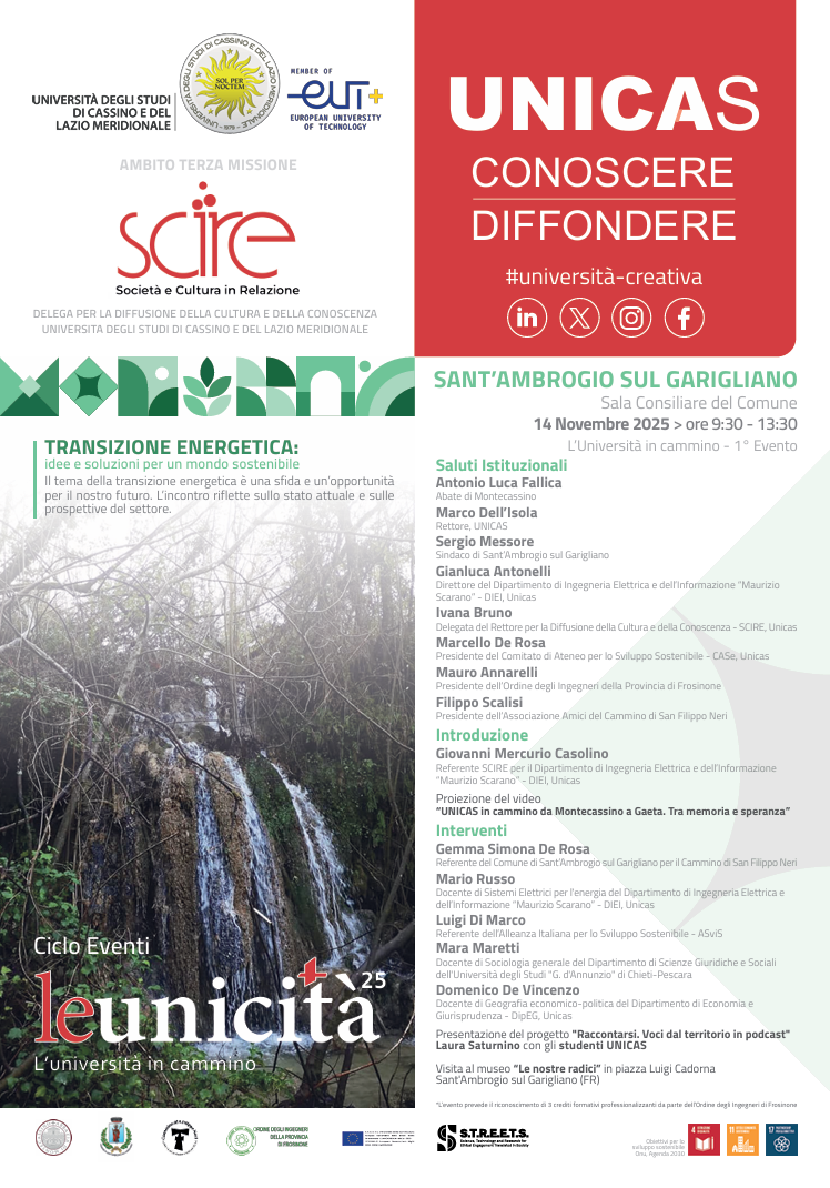 L’incontro, curato dal Dipartimento di Ingegneria Elettrica e dell’Informazione “Maurizio Scarano” – dell'Università degli Studi di Cassino e del Lazio Meridionale – Referente SCIRE Giovanni Mercurio Casolino – è promosso nell’ambito delle attività di Terza Missione, su iniziativa della Delega del Rettore per la Diffusione della Cultura e della Conoscenza, e rientra nel ciclo di eventi culturali “Le Unicittà 2025. L'Università in cammino”.
