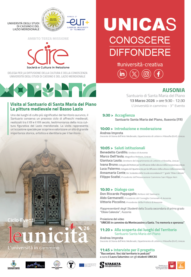 L’evento, curato dal Dipartimento di Lettere e Filosofia dell’Università degli Studi di Cassino e del Lazio Meridionale, con il coordinamento del prof. Andra Improta, è promosso nell’ambito delle attività di Terza Missione su iniziativa della Delega del Rettore per la Diffusione della Cultura e della Conoscenza.